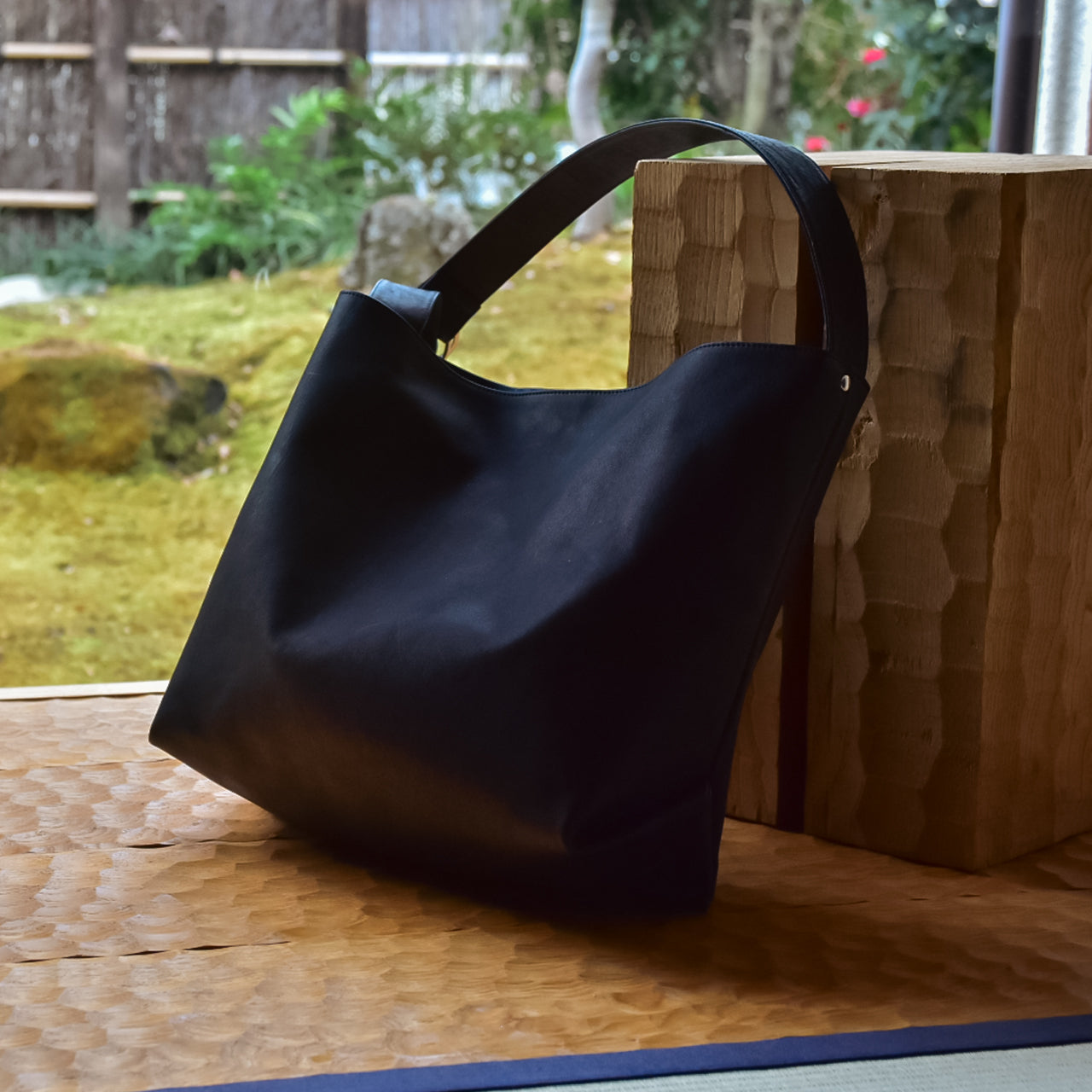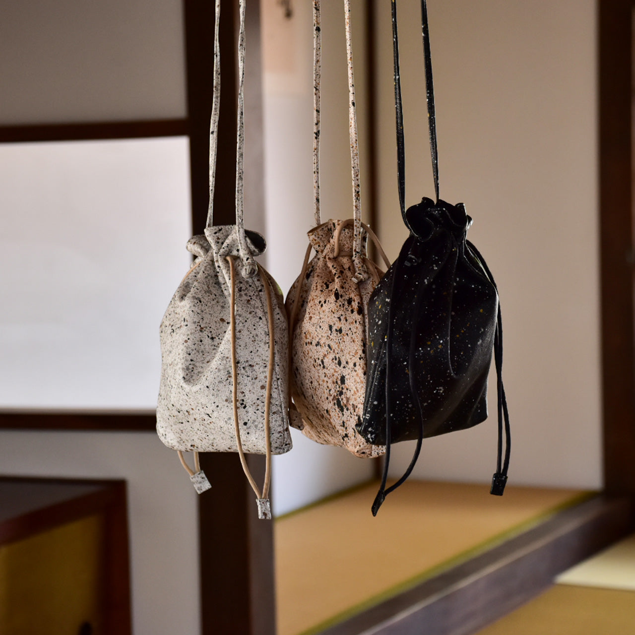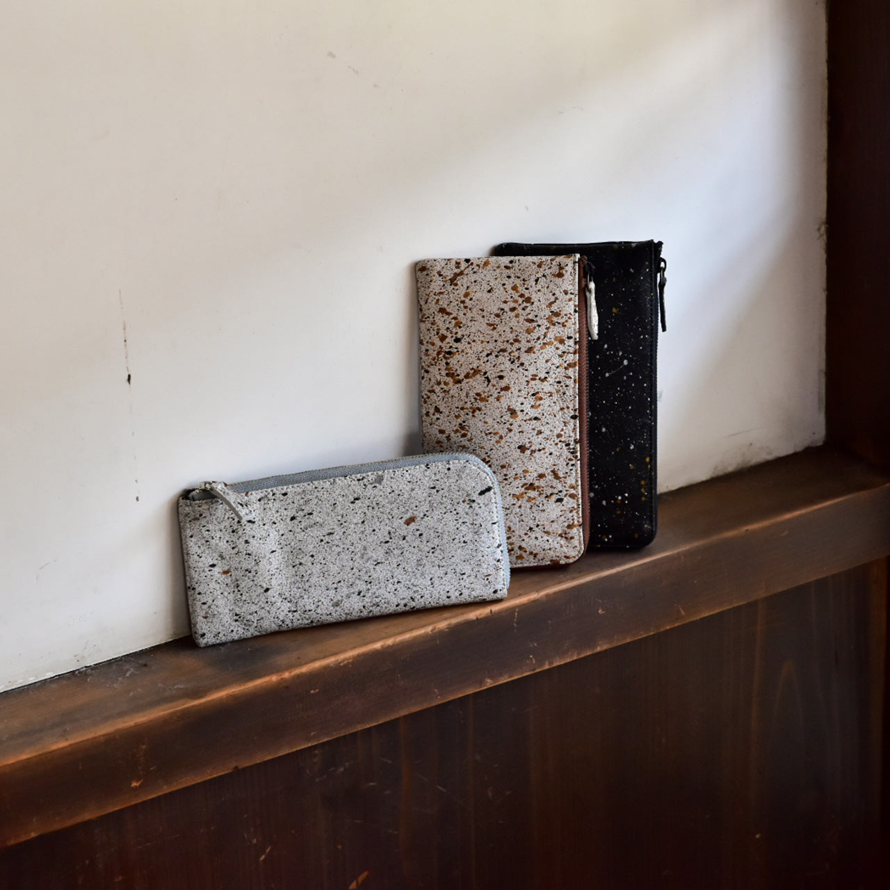 室町時代に活躍した水墨画家、雪舟の水墨画をオマージュしたムラ染めの革を使用。本来、革の染色では色ムラを出さないようにするが、あえて色ムラを出すという遊び心から生まれた、他の革とは一線を画す革。革の染色歴40年の職人が染料の投入量・色・太鼓の回転数・タイミングに試行錯誤を重ね作り上げた大量生産が難しい逸品。